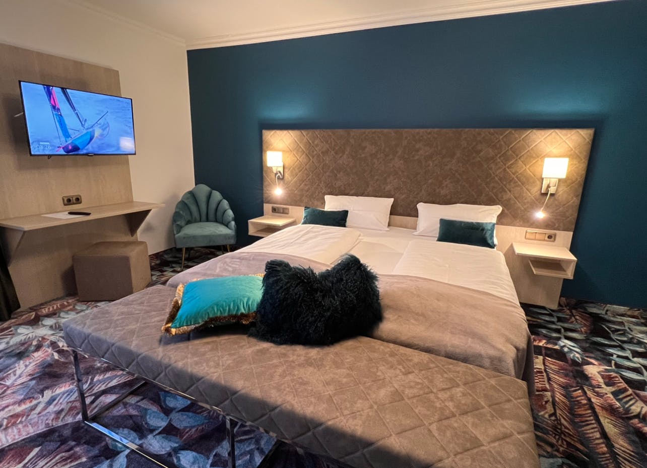 Deluxe Doppelbettzimmer für 2 Personen mit Kingsize Bett / Boxspringbett Unsere Deluxe Doppelzimmer wurden neugestaltet - diese sind modern und mit einem großem Kingsize Bett / Boxspringbett ausgestattet. Die Bäder sind mit einem großem Granitwaschtisch und einer großen Dusche ausgestattet. Die Deluxe Doppelzimmer Appartements verfügen über eine Küchenzeile und sind mit dem Wichtigsten ausgestattet. Diese Deluxe Doppelzimmer haben ca. 33 m² und sind für 2 Personen geeignet.